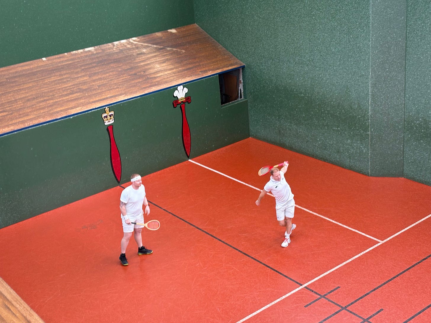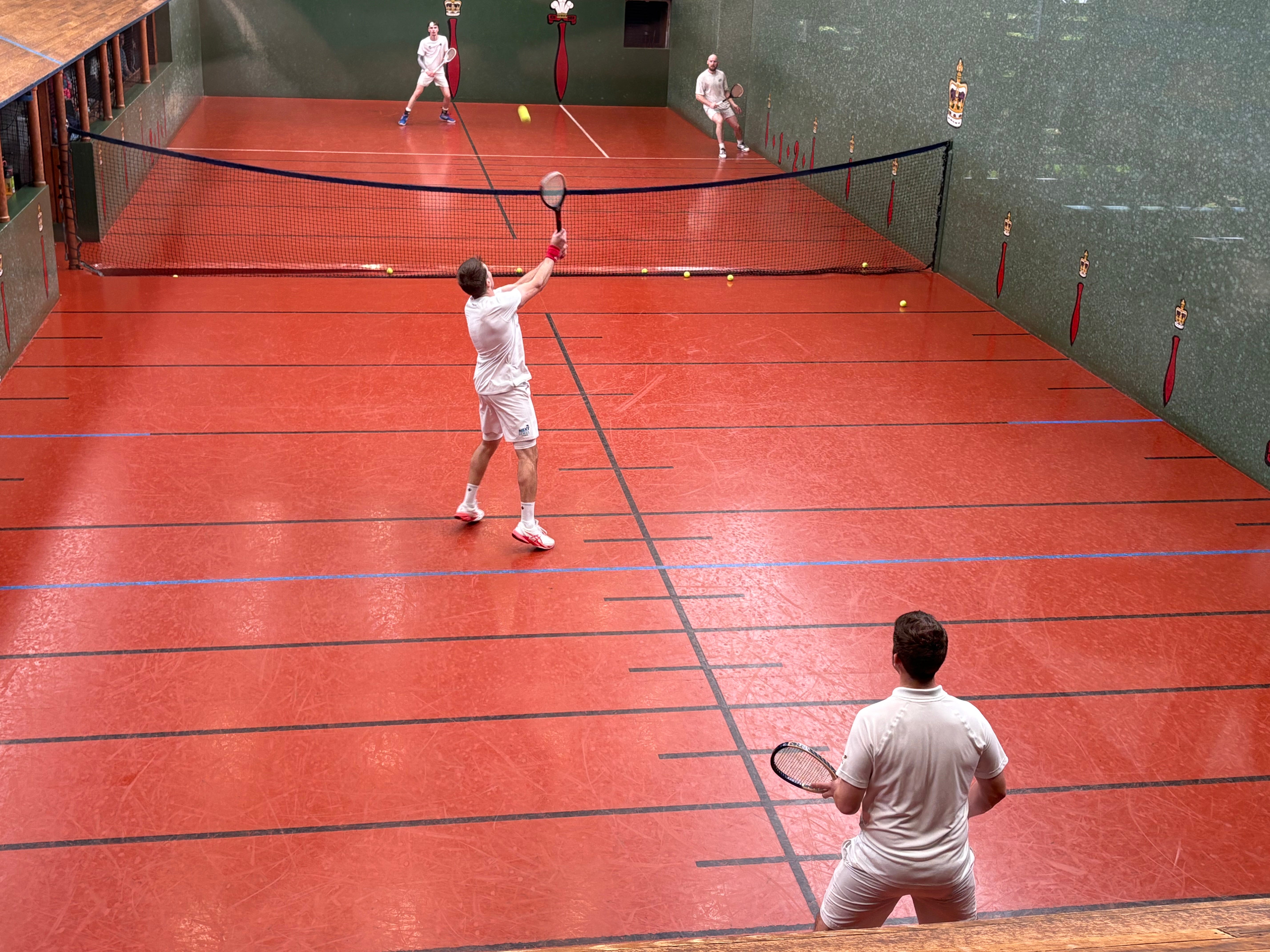 Merola kept Howell’s serve for the second set, still trying to pin him down on the high serve. Though Henman kept the audience on the edge of their seats with his high-octane play across the front of the court, Virgona’s ability to kill the ball won out for the first two games, before fighting to a draw in the third as the players exchanged ten deuces over a quarter of an hour. Howell and Virgona came through the winners in that game, and the tight fourth which followed. From there, the scoreboard pressure became too immense, capitulating in the final couple of games before conceding the set to switch receivers for the third.