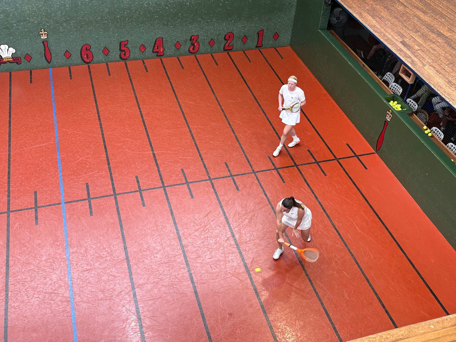 Riviere was at the peak of his powers going into the second set, keeping the energy high and entertaining the crowd with his extreme prowess and strokemaking. Chapman joined in the fun too at times, but was mostly playing a stabilising role to Riviere’s chaos. One amusing point saw Riviere launch a high back wall that flew back over to his side of the net for him to attempt to volley again — called correctly as a double hit. Riviere was more than happy to entertain the crowd of Boomerang Cup players, filling out all of the galleries of the court. Gale and Williams were only too happy to join in the fun, playing an exhilirating match of doubles, but Riviere was the main attraction. He and Chapman won the final two sets comfortably, closing out the list of finalists.