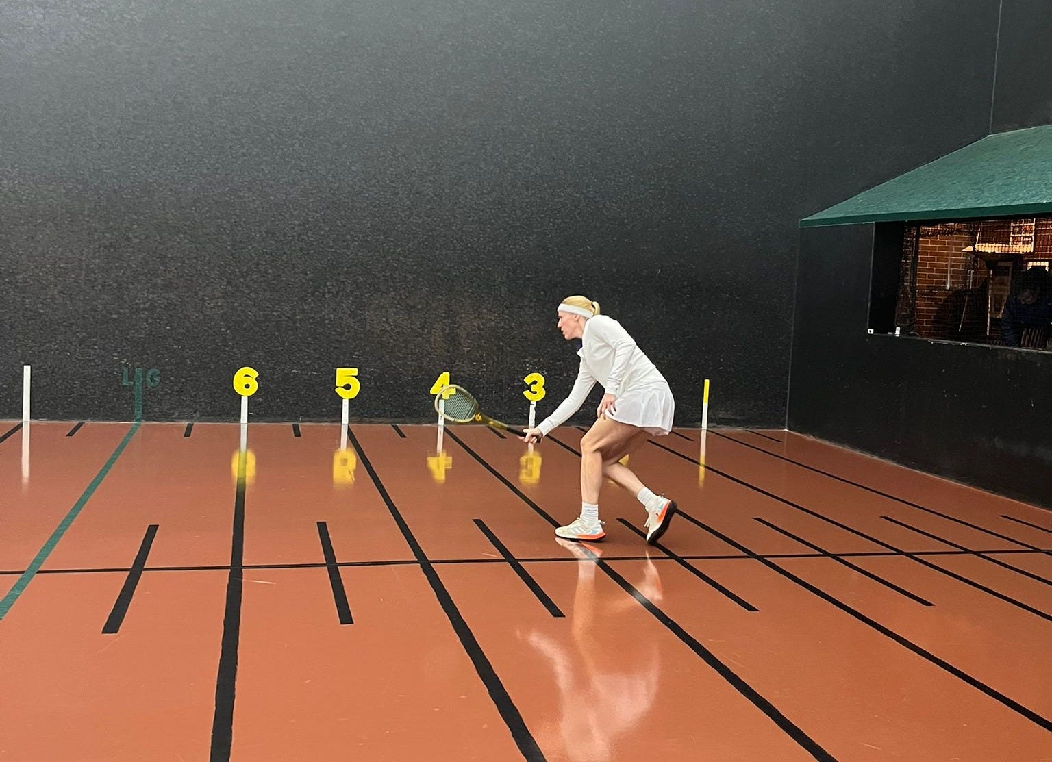 Fahey was clinical from the very first ball. Her shots were clean and precise and errors few and far between. Despite having played each other 12 times before over the past decade, Bollerman was no closer to making a dent in Fahey’s game, let alone improving on her personal best of three games in a match. Even when Fahey did err slightly, the next ball was so strong as to make up for the mistake. Even so, she was still furious at herself for missing the shot in the first place. Otherwise, it was a complete performance, with her cut-volley, her serving, her tambour play and her groundstrokes all working in sync. Bollerman’s best hope was to hit a gallery as quickly as possible, but even that would expose her to a devilish cut-volley on the change of ends. Bollerman’s only game came midway through the first set when she strung together a series of unreturnable serves.