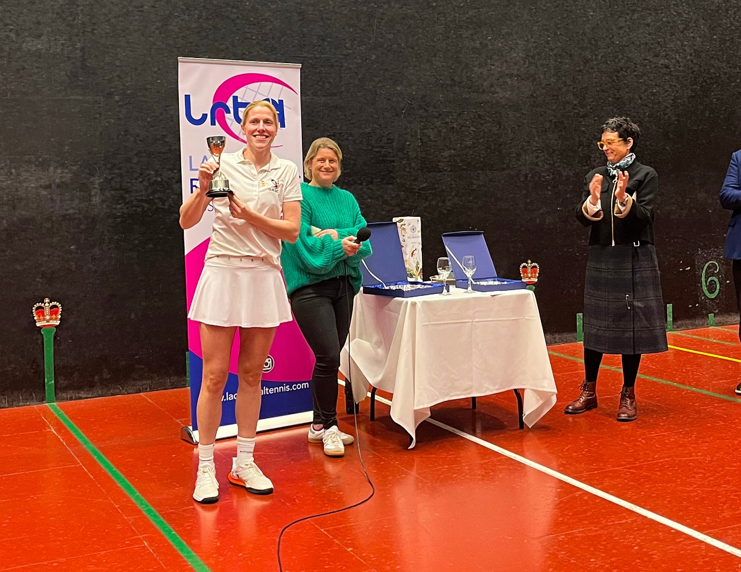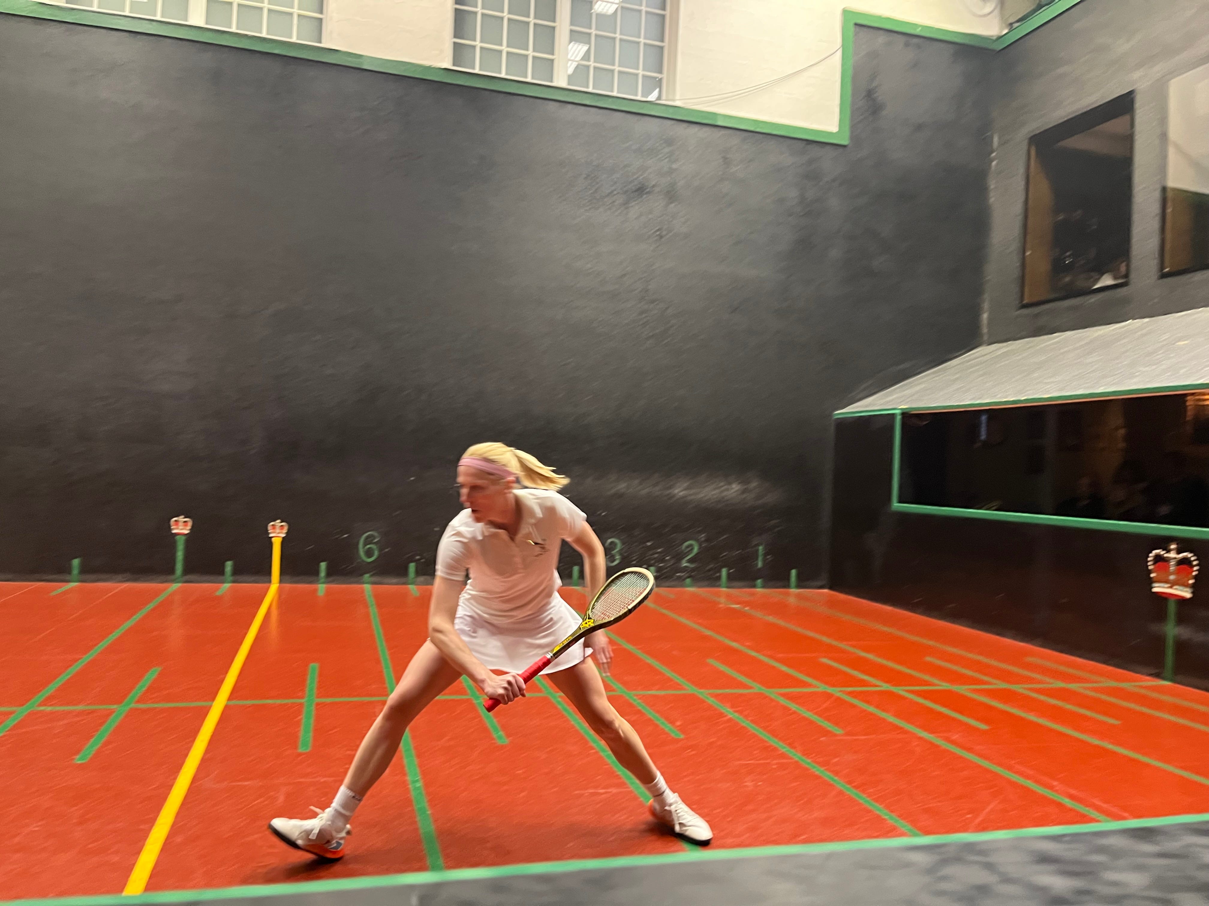 It was a historic moment when Claire Fahey and Tara Lumley stepped onto the east court at the Queen’s club to prepare for the final of the women’s draw. Only three times in the late 1980’s had the women’s British Open been held at the country’s premier real tennis venue. The winners on those occasions had been Lesley Ronaldson, Sally Jones and Tara’s mother Penny, the latter of whom resumed her place in the dedans having just watched her other child John in the earlier match. Outside of the World Championships, women’s tennis had never previously had a larger stage.