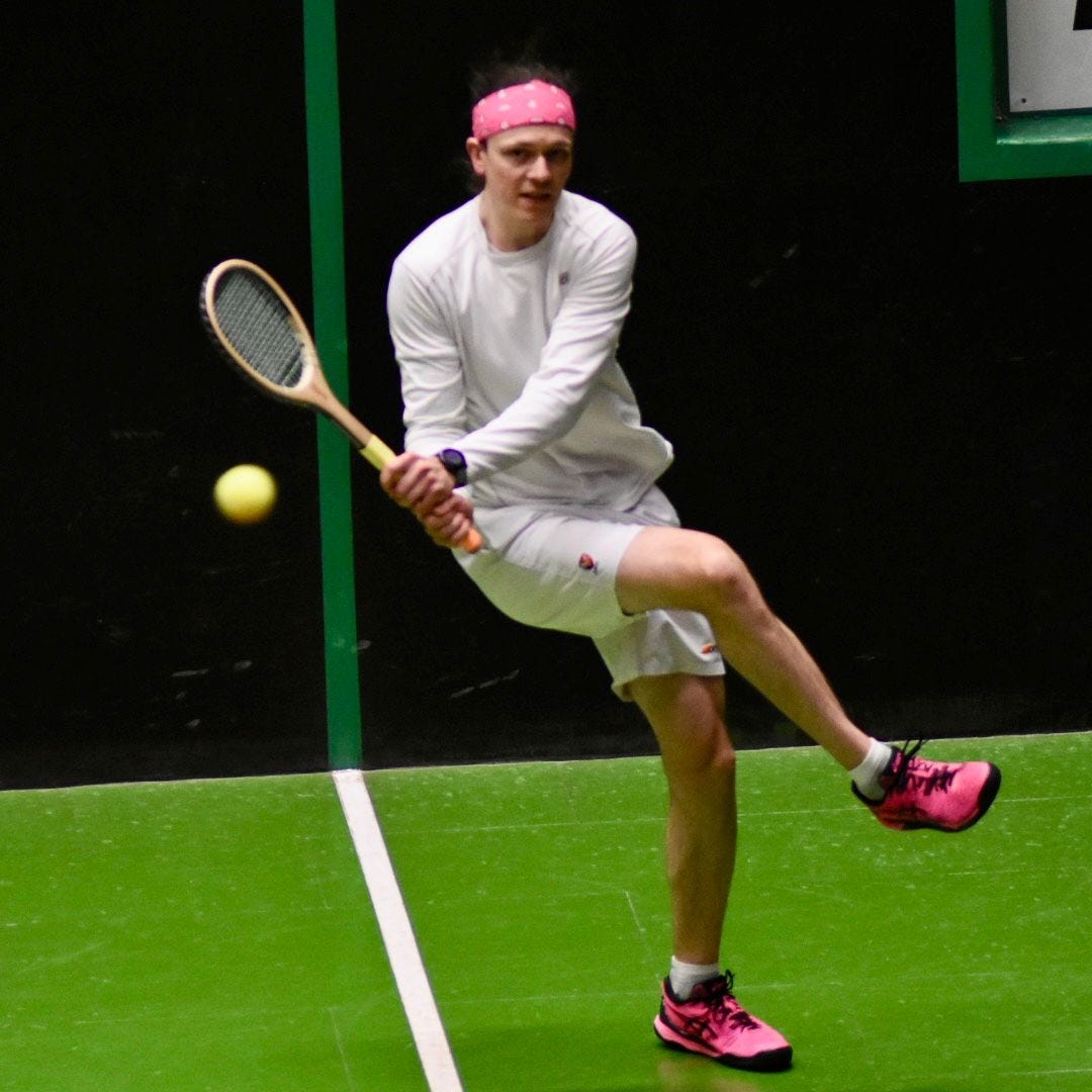Into the third set, Dodgson continued his care-free policy of pushing high and cutting off as much as possible from the middle of the court, including playing several volleys with his backside on the floor. The set was close from start to finish, with neither pair winning more than a game’s lead before again reaching a deciding eleventh game. When it counted, Woods-Casey’s back-court volley came good, propelling them into a lead before heading down to the hazard end with two hazard chases in tow. On the first, Woods-Casey struck a low ball onto the battery wall, which sent Hamilton jumping out of the way, but with Lumley unprepared when backing up. A volley error on the next ball gave the set to the sixth seeds.