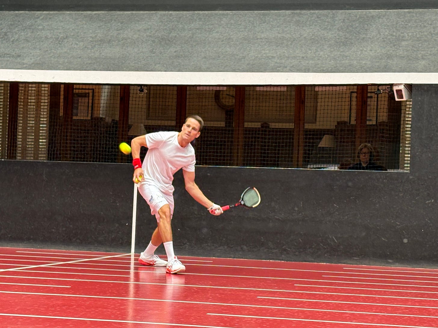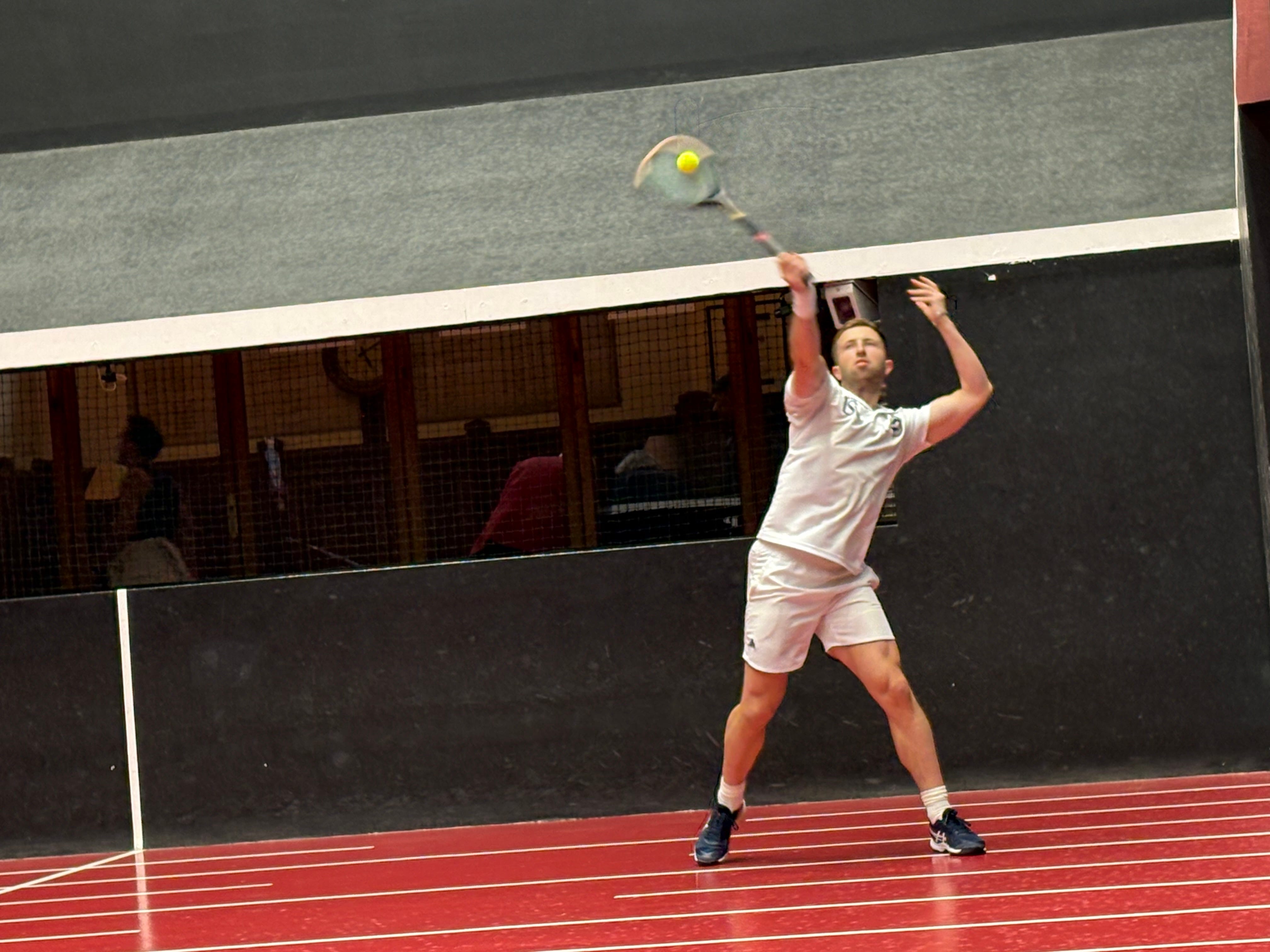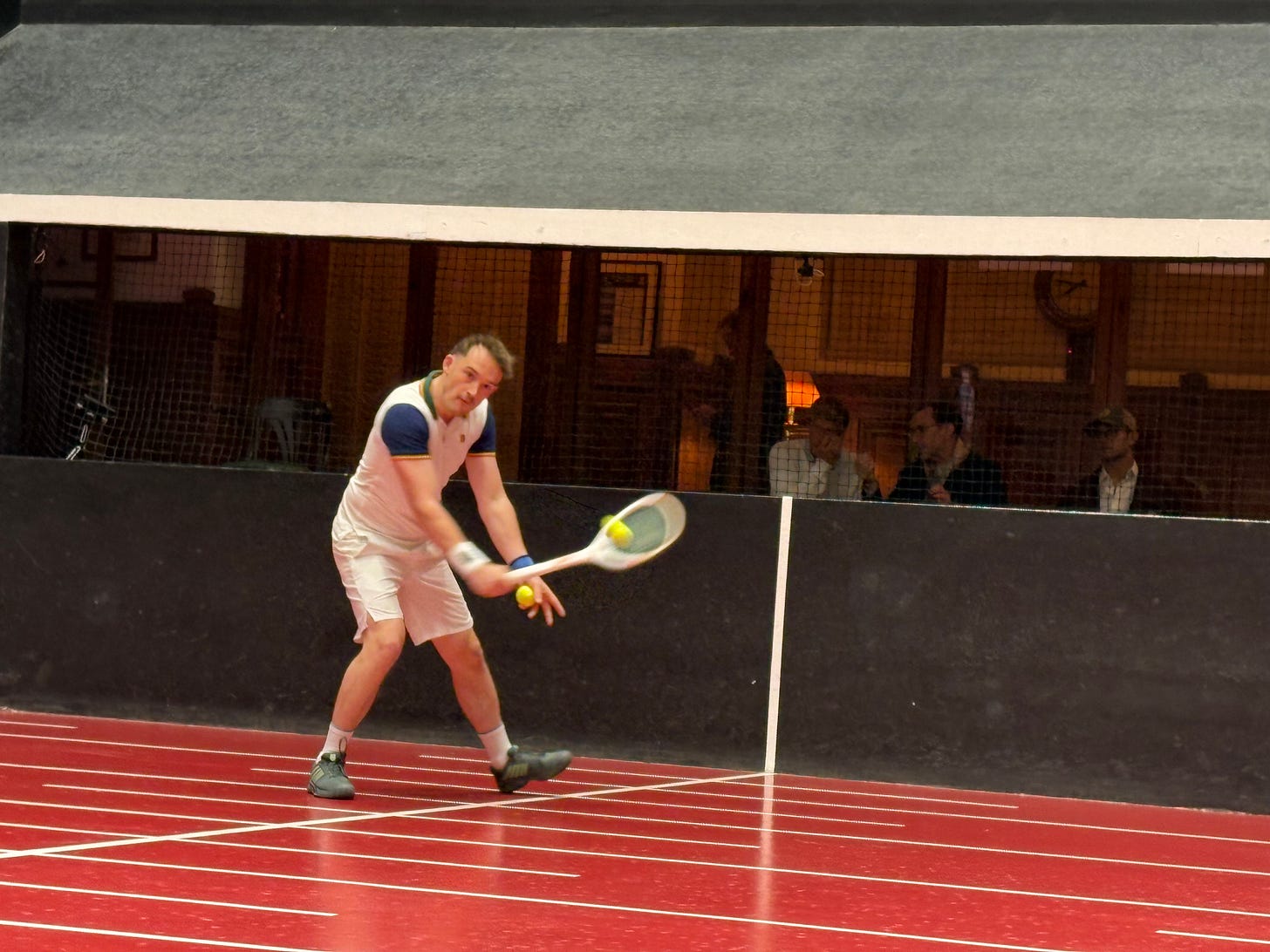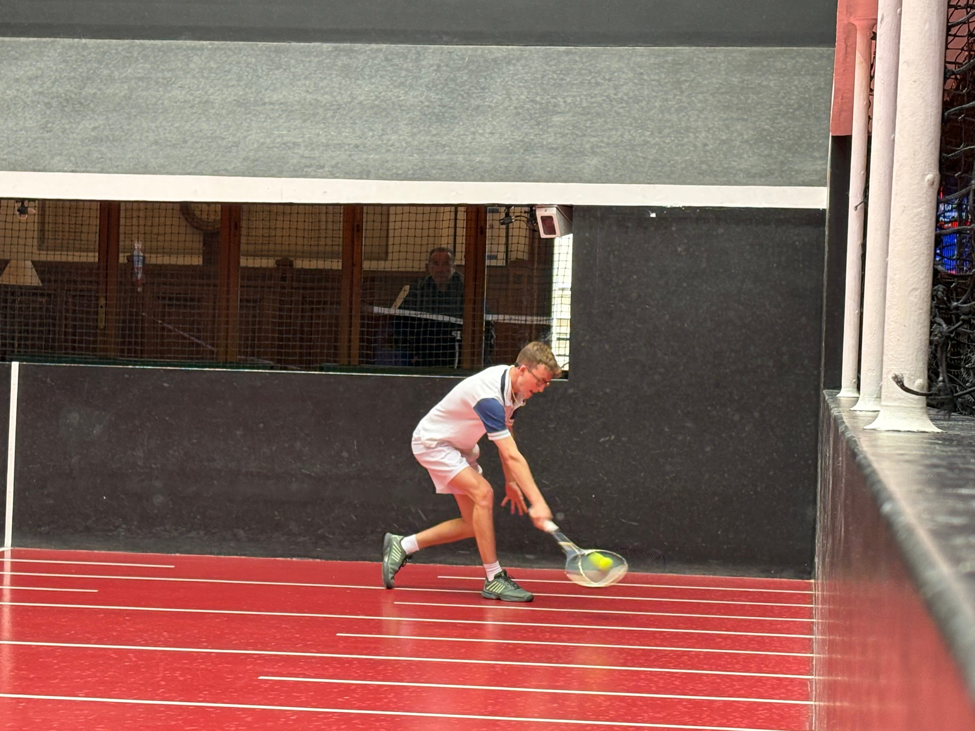 Howell was not going to take the loss of the first set lightly. He tightened up his game going into the second set and started to press and attack rather than sit back and push the ball around. Hamilton’s forcing became more desparate as the scorebaord pressure started to bite. By the end, he gave a way a deliberate double fault to move on and focus on the third set. Once there, Hamilton was perfectly content in rallying with Howell, as the world number 3 found it difficult at times to find winners, whereas Hamilton backed his force to get him a chase, if not a dedans or a grille. After exchanging games to 2-all, Hamilton broke away, winning the next three games. In the 5/2 game, Hamilton saw six set points come and go as he searched for the final winner. It wasn’t until he feathered a ball past the tambour on the eighth set point two games later before he converted into a 2-1 lead.