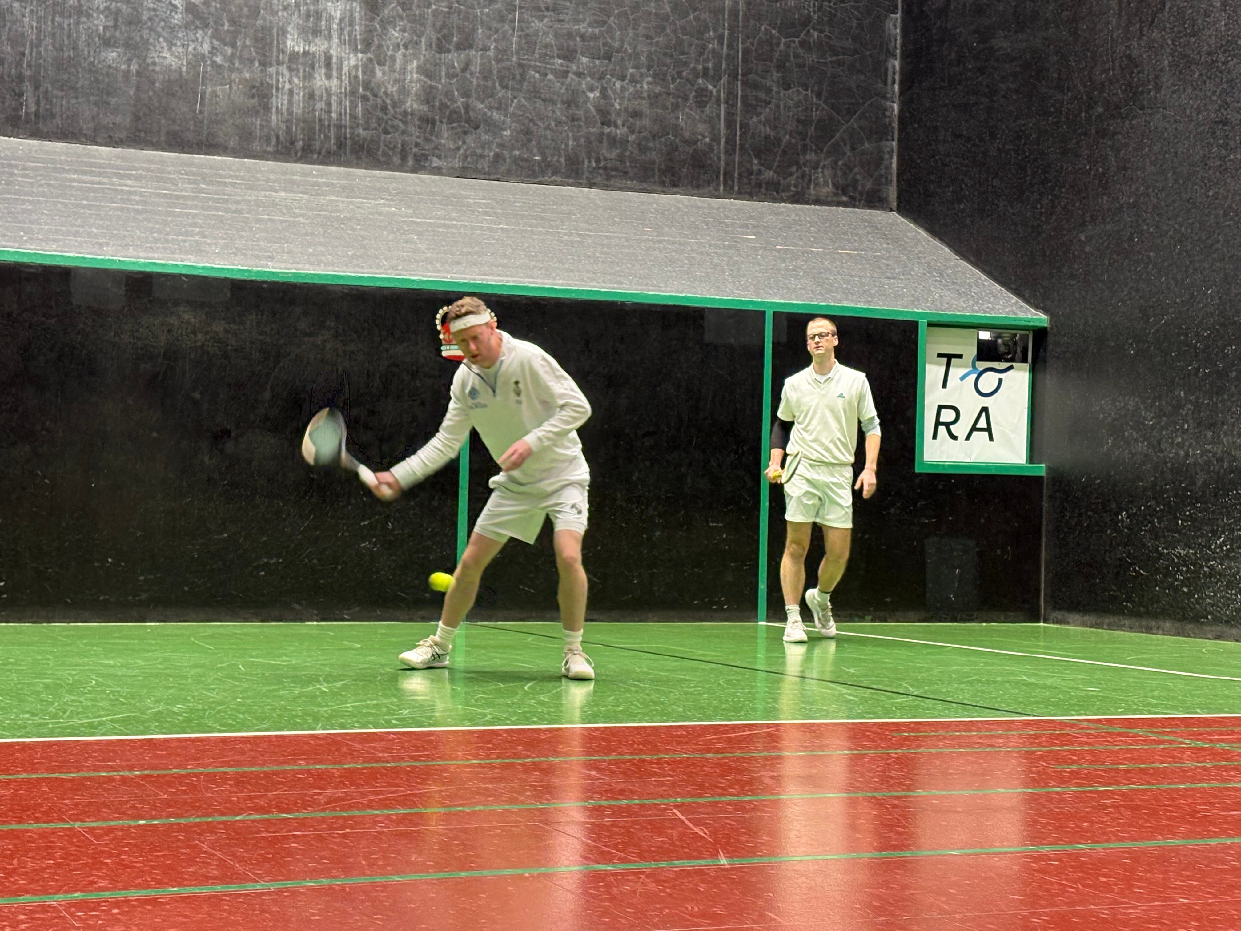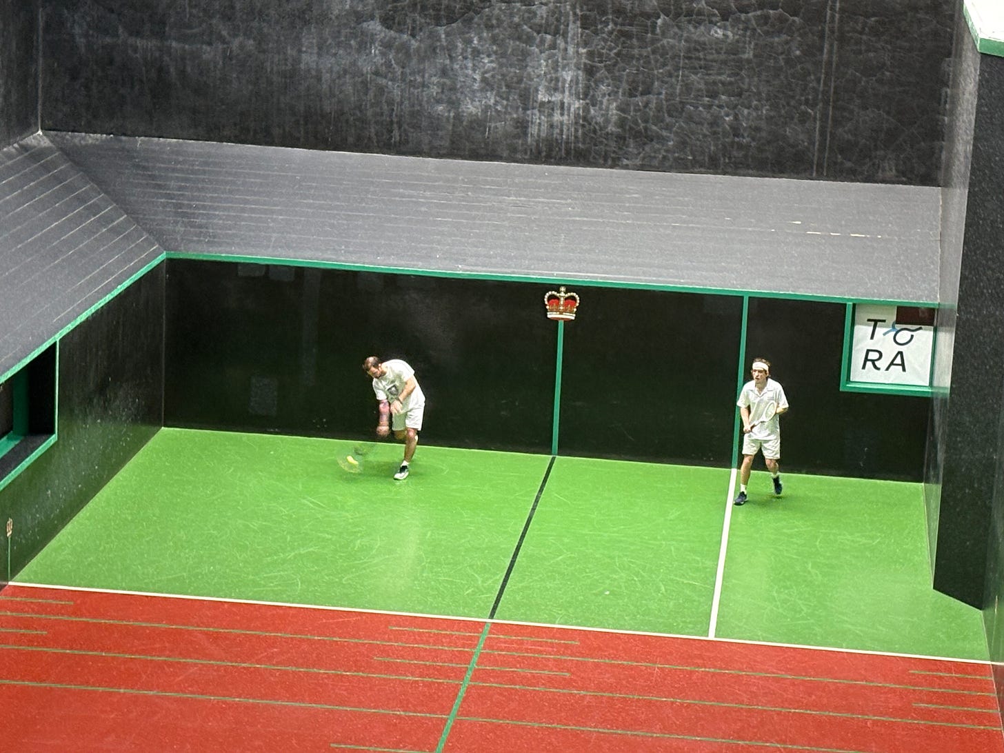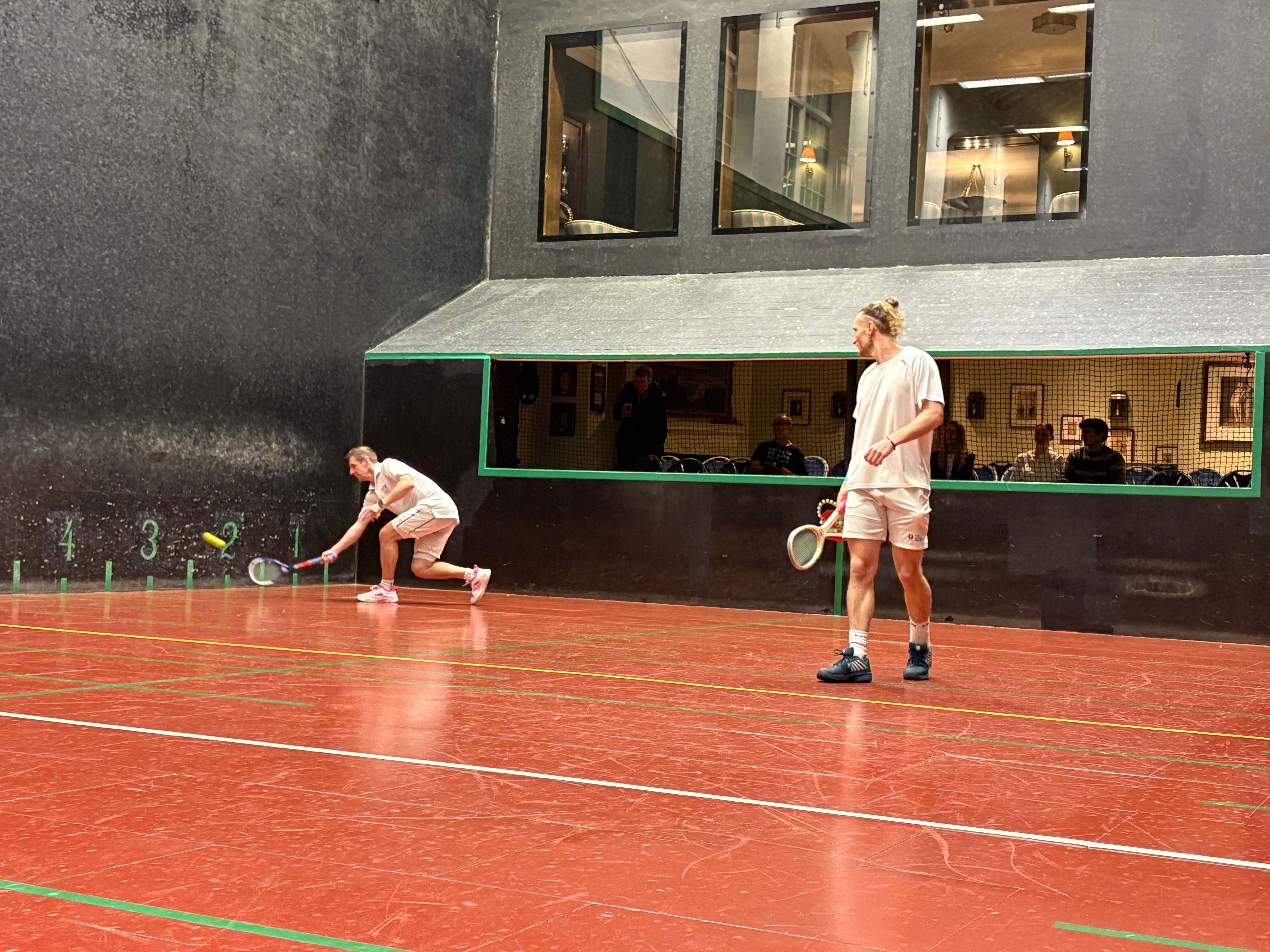 The first doubles qualifier pitted Oxford’s Benedict Yorston and Craig Greenhalgh against Ned Batstone and James Medlow — the former having both lost their singles qualifying matches the day prior, and the latter having both won theirs, even though none of the players had yet graced the court together in the tournament. Yorston and Greenhalgh poached an early 3/1 lead with Yorston holding a high line as the gallery player. Medlow and Batstone quickly settled into a good rhythm, with Medlow reading the court well from the back and Batstone getting his eye in quickly at the galleries. The first set was notable for the number of unreturnable flush back-wall balls catching both pairs out. Once Batstone and Medlow had seized the initiative, helped by Batstone’s accurate forcing, Greenhalgh and Yorston switched to having Yorston at the back, but it could not turn around the run of their opponents. Greenhalgh and Yorston’s situation was not helped by a number of late reactions from Greenhalgh. Medlow and Batstone won five of the last six games of the set, despite having to fight through a long deuce battle in the final game.