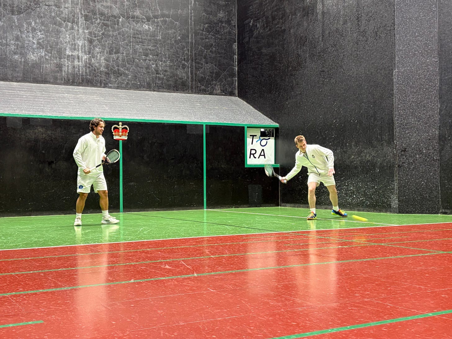 Medlow was fired up at the start of the second set, slapping Batstone’s hand so hard in a high five after winning the first game that it sounded like a clap of thunder — contrasted with the polite fist-bump of Smith and Hollins upon winning the second. The fourth game was yet another tight battle, with the tension building shot after shot. From 1-all, to 2-all, 3-all and 4-all, there was little to separate the pairs as Medlow found himself of the receiving end of a relentless barrage of shots at back of the court. Batstone and Medlow were within inches of taking the match in the 5/4 game. With a ball hitting just above the penthouse on a long chase on match point, Smith and Hollins sent it to a deciding game instead. The rallies in the final game were long and nervy, with Smith and Hollins giving Medlow’s forehand a thorough examination. Medlow and Batstone beat the first set point against them with a nick roller. Then, after leaving a long railroad for a hazard chase, Medlow and Batstone defended the second with a lovely shot down Smith’s forehand side. Smith won the set on the third attempt: a cut-volley, main-wall dedans that snuck past Medlows flailing racket.