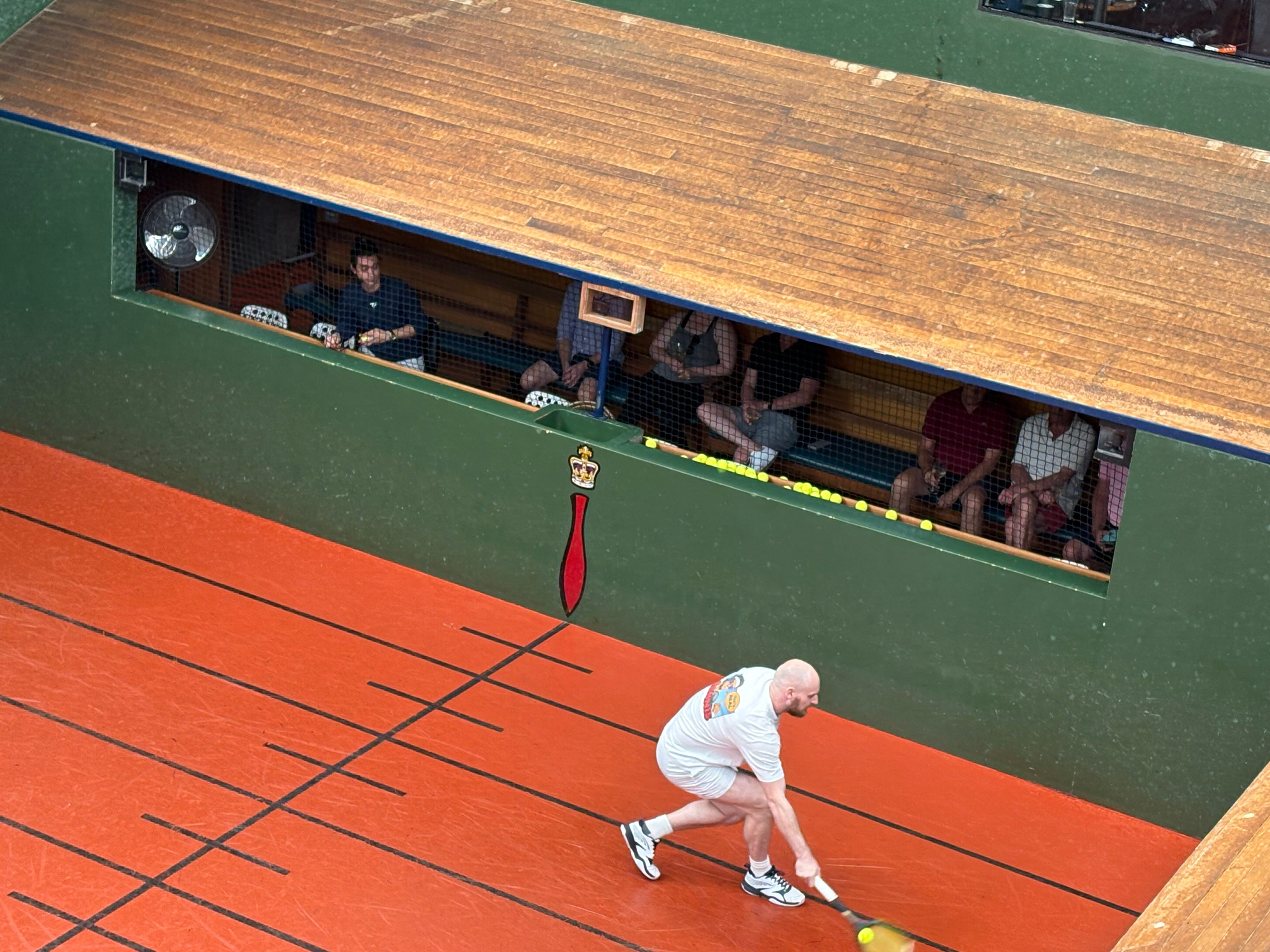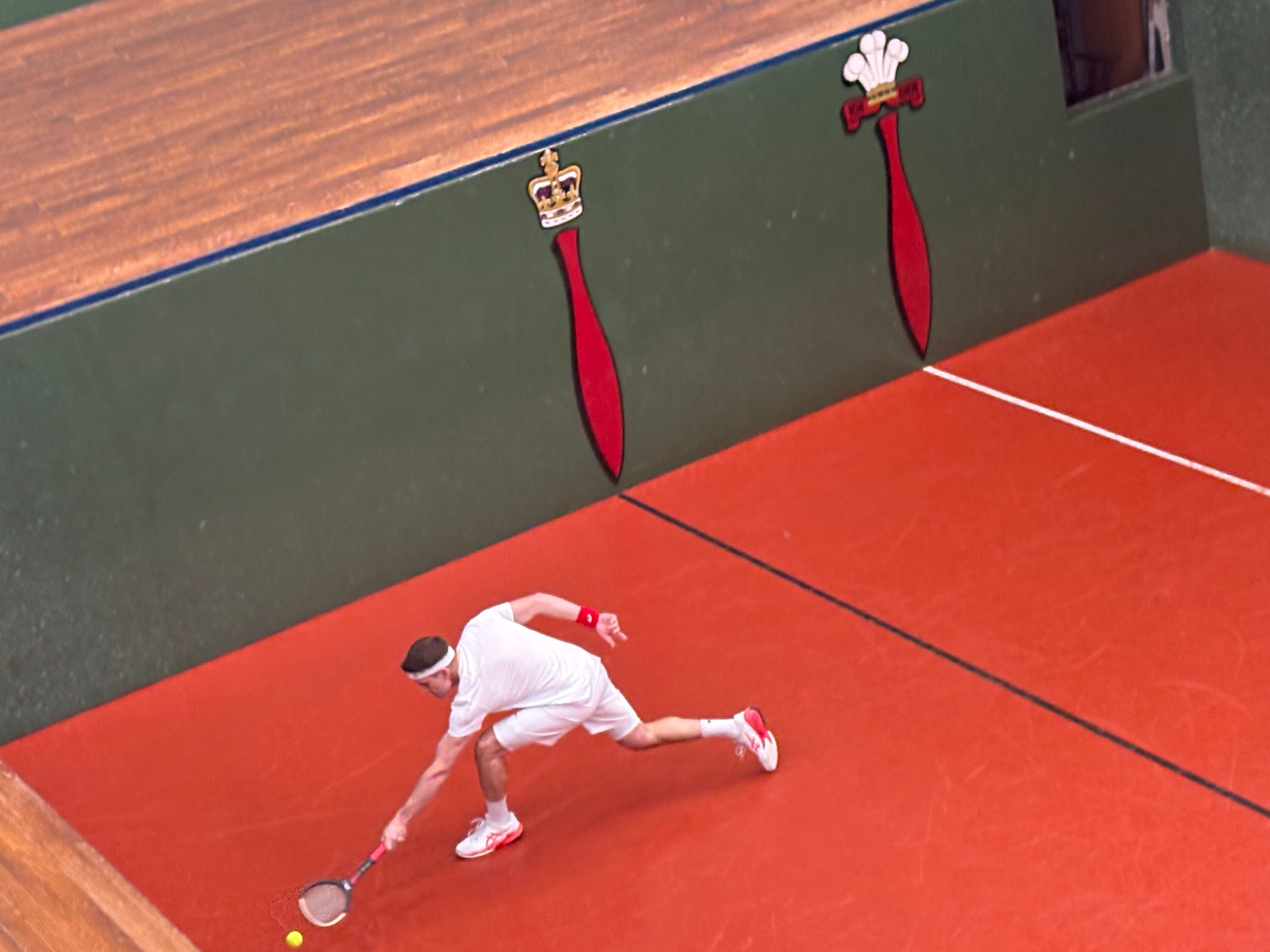 It wasn’t until he was 0/4 down in the second set before Rosedale rediscovered a hint of attacking spirit, slamming his first grille of the match to win one game then sending a bullet of a force into the dedans that missed Merola by milimetres. From then on, Rosedale improved his defensive volley and at last stopped the unrelenting Merola onslaught. His confidence grew and was again matching Merola shot for shot. By the third set, he was in control of proceedings while Merola was struggling to cope with the heat on court. He repeatedly found the grille as he lead the third set from start to finish.