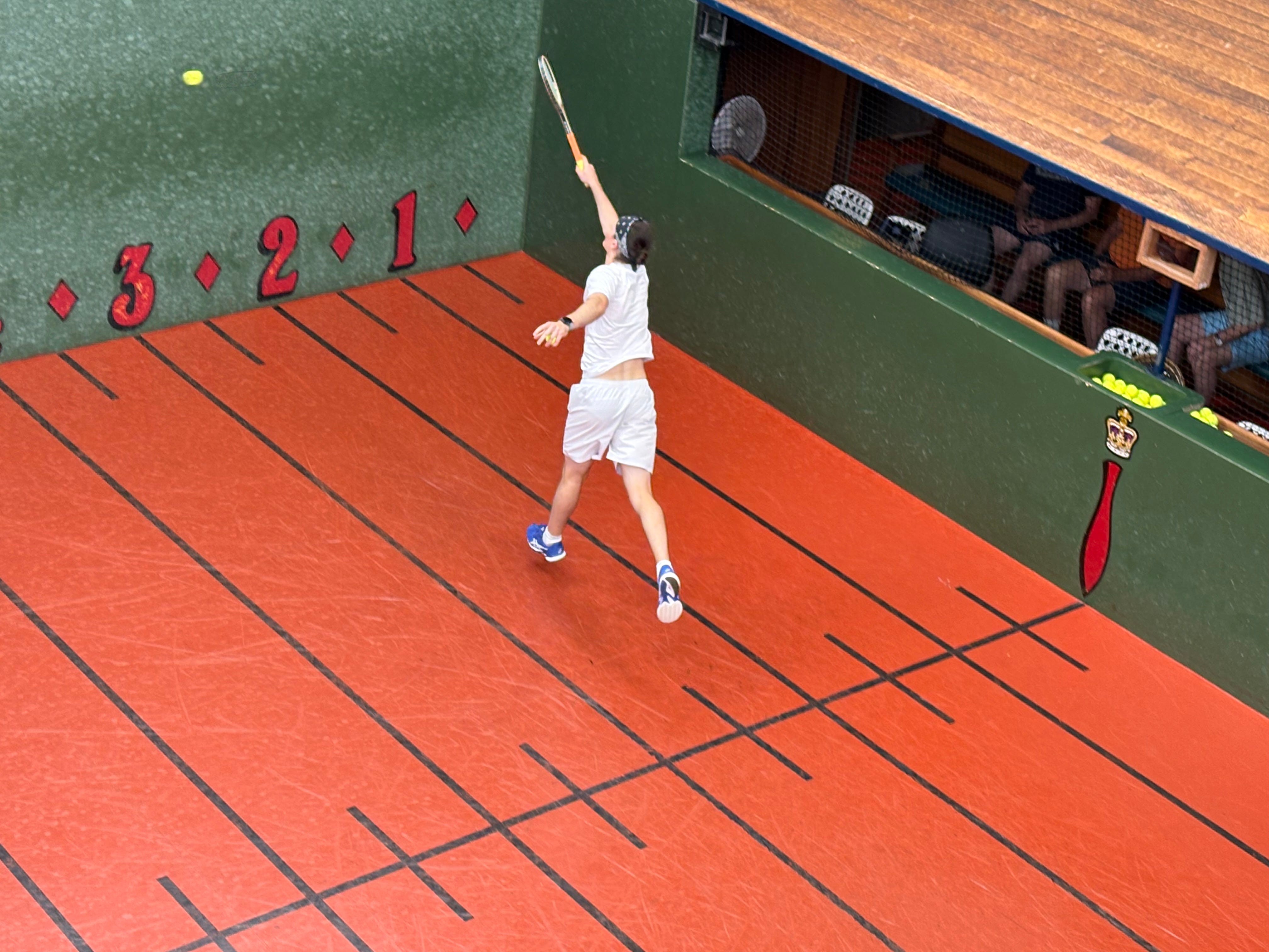 From one World Champion to another, as Claire Fahey’s quarter-final match against qualifier Rachel Hollington followed on. Fahey was on for a golden set for the first 21 points out of 24 needed, never missing a ball until Hollington finally found a ball that nicked the join between the main wall and the tambour. Hollington picked up four further points — including one off a double fault — in the second set, but in the end Fahey cruised to victory in just 27 minutes.