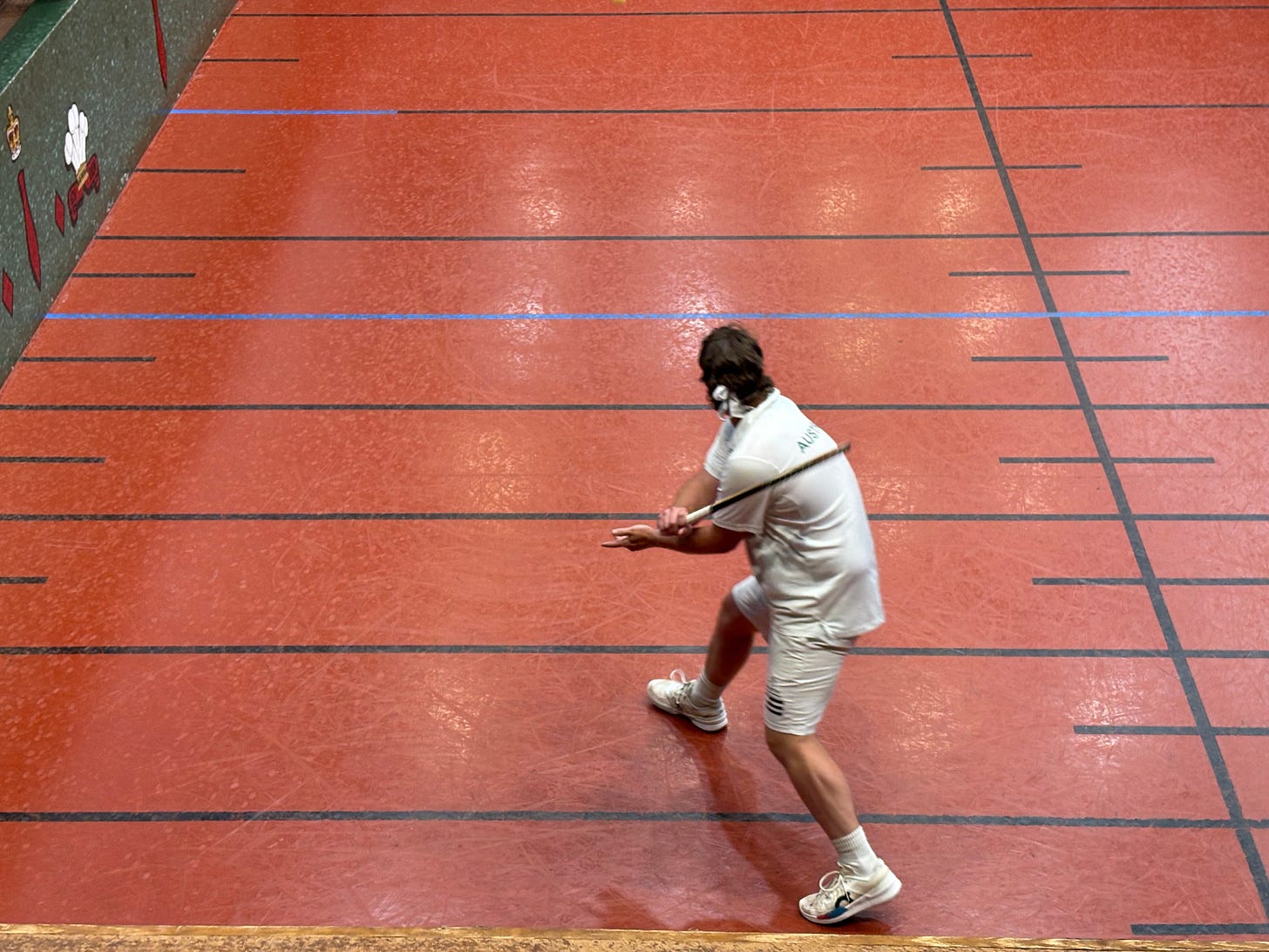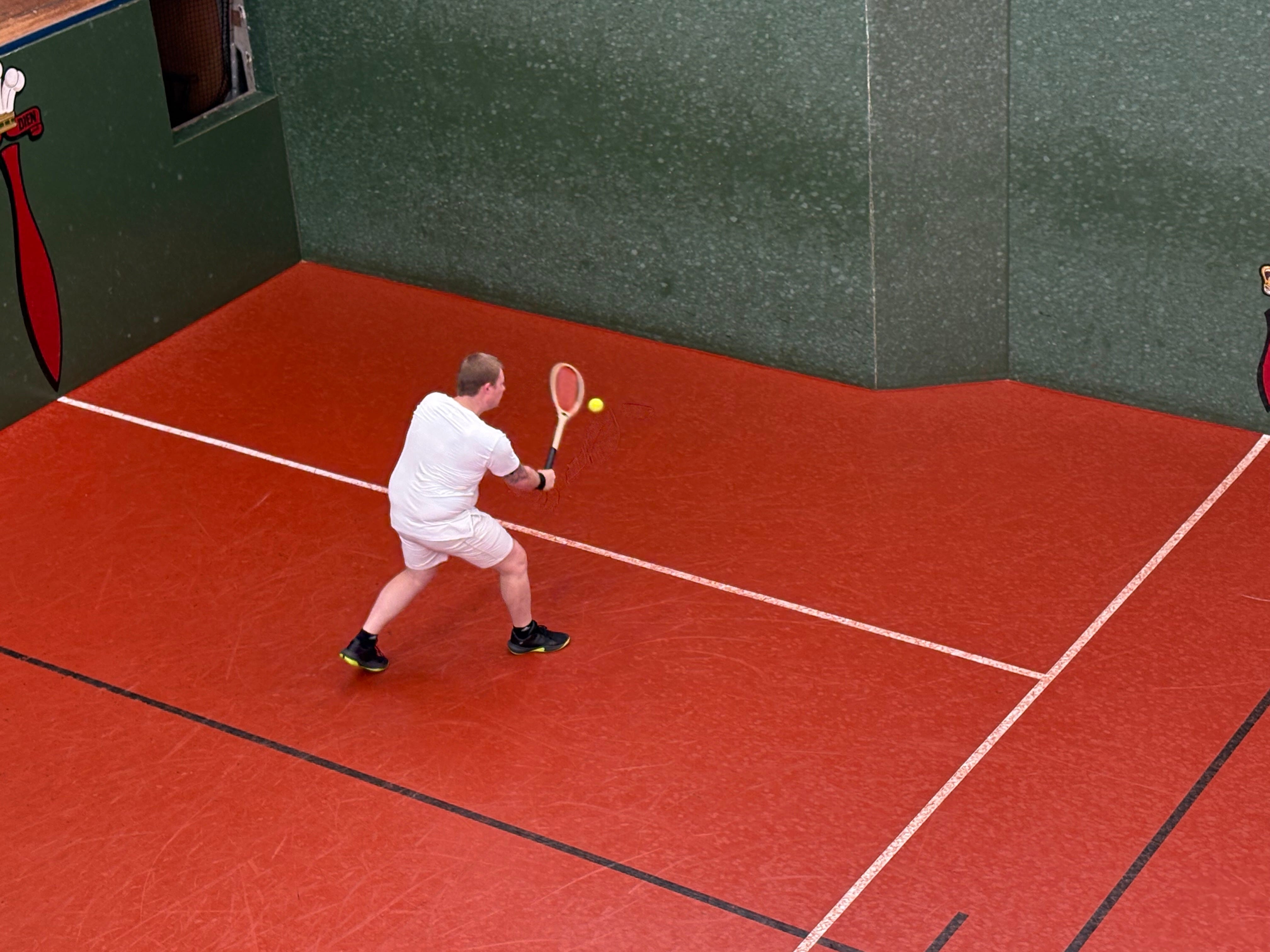 The second match was the much anticipated battle of the Royal Melbourne Tennis Club pro shop, with the senior professional Chris Chapman taking on the assistant professional John Woods-Casey. The first set was very closely matched, with plenty of play up and down the main wall as each tried to beat the other for pace. Chapman, as always, was picking balls out of the air and slamming them at the dedans, while Woods-Casey was experimenting with different variations of spin. Ultimately, Woods-Casey spent too much time at the hazard end to benefit from his advantage in the longer rallies, with Chapman finishing the set with a blasted dedans.